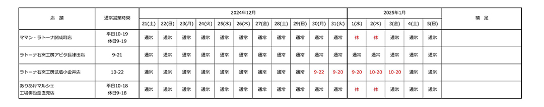 - 2025/12/08直営店・お客様相談室 年末年始休業日のご案内